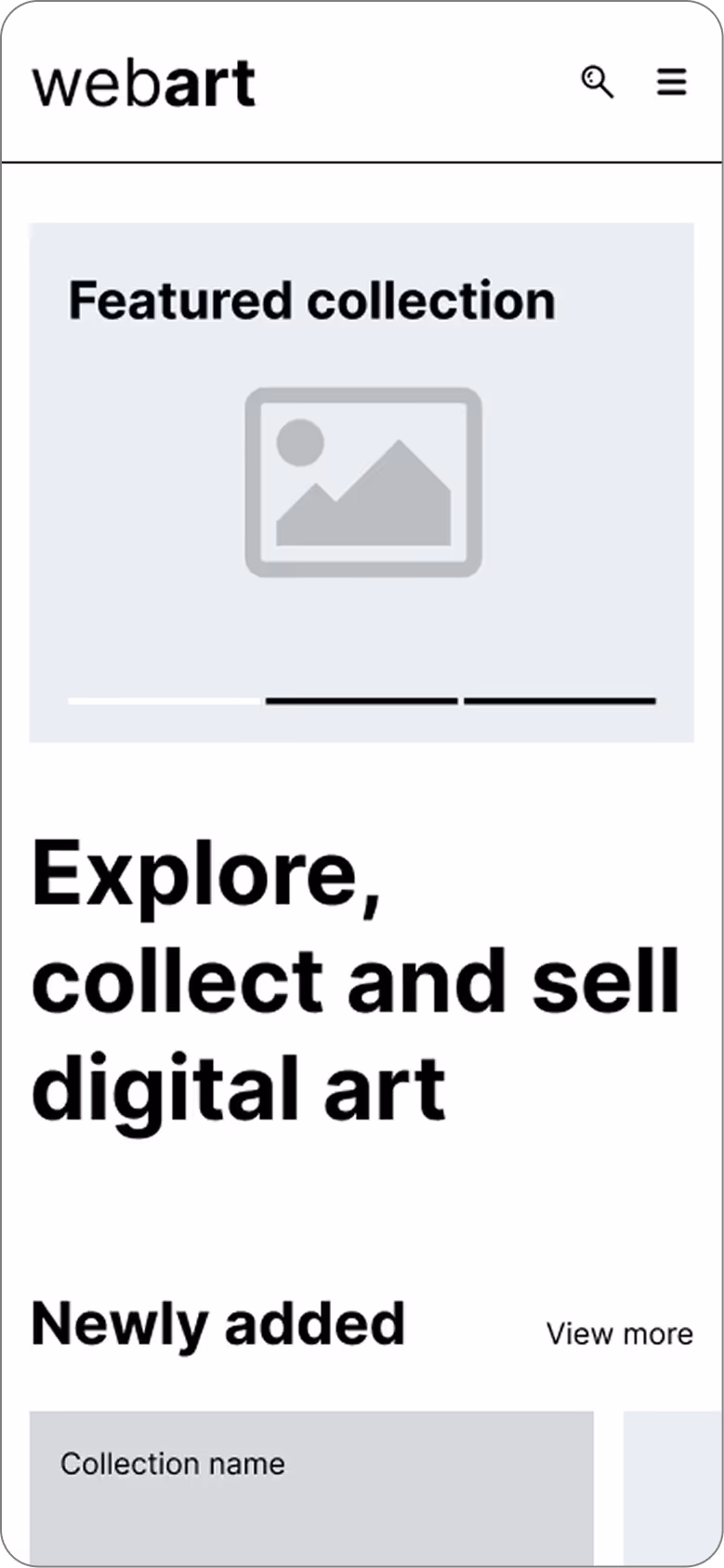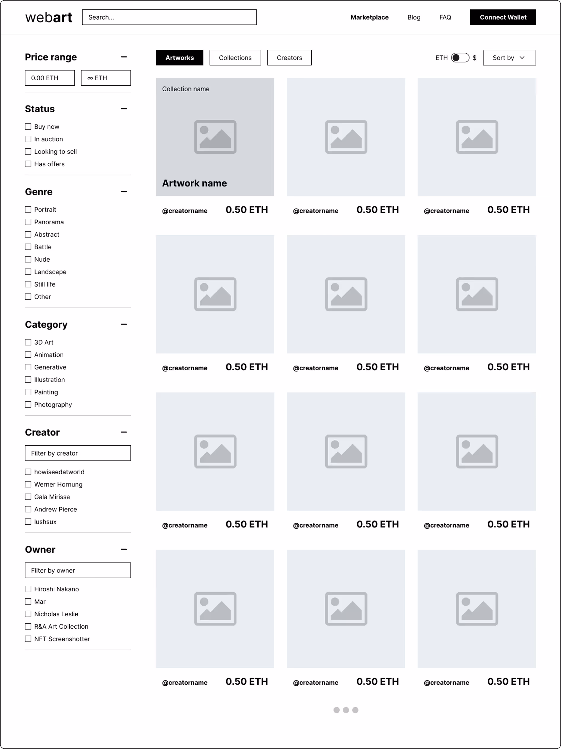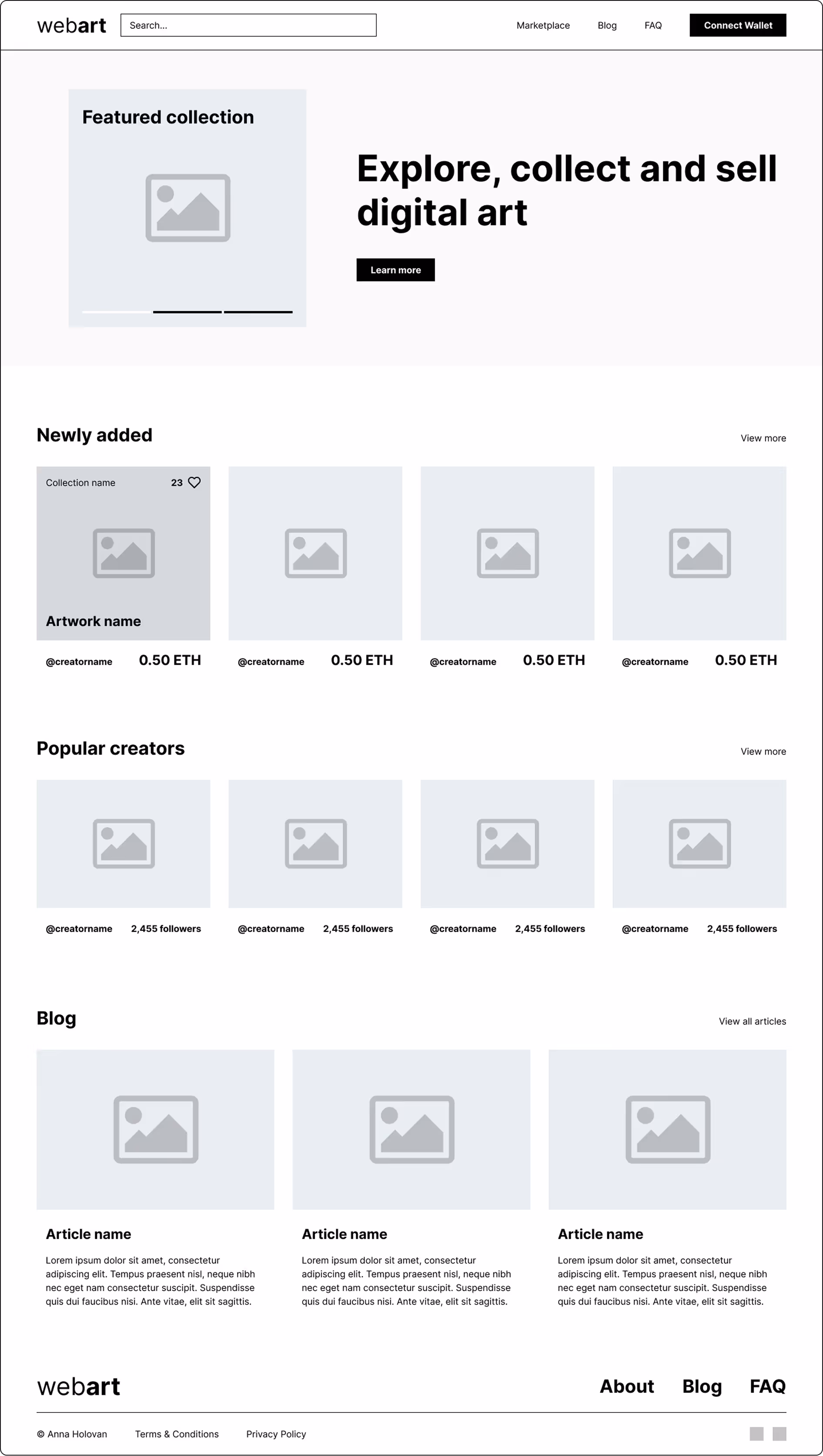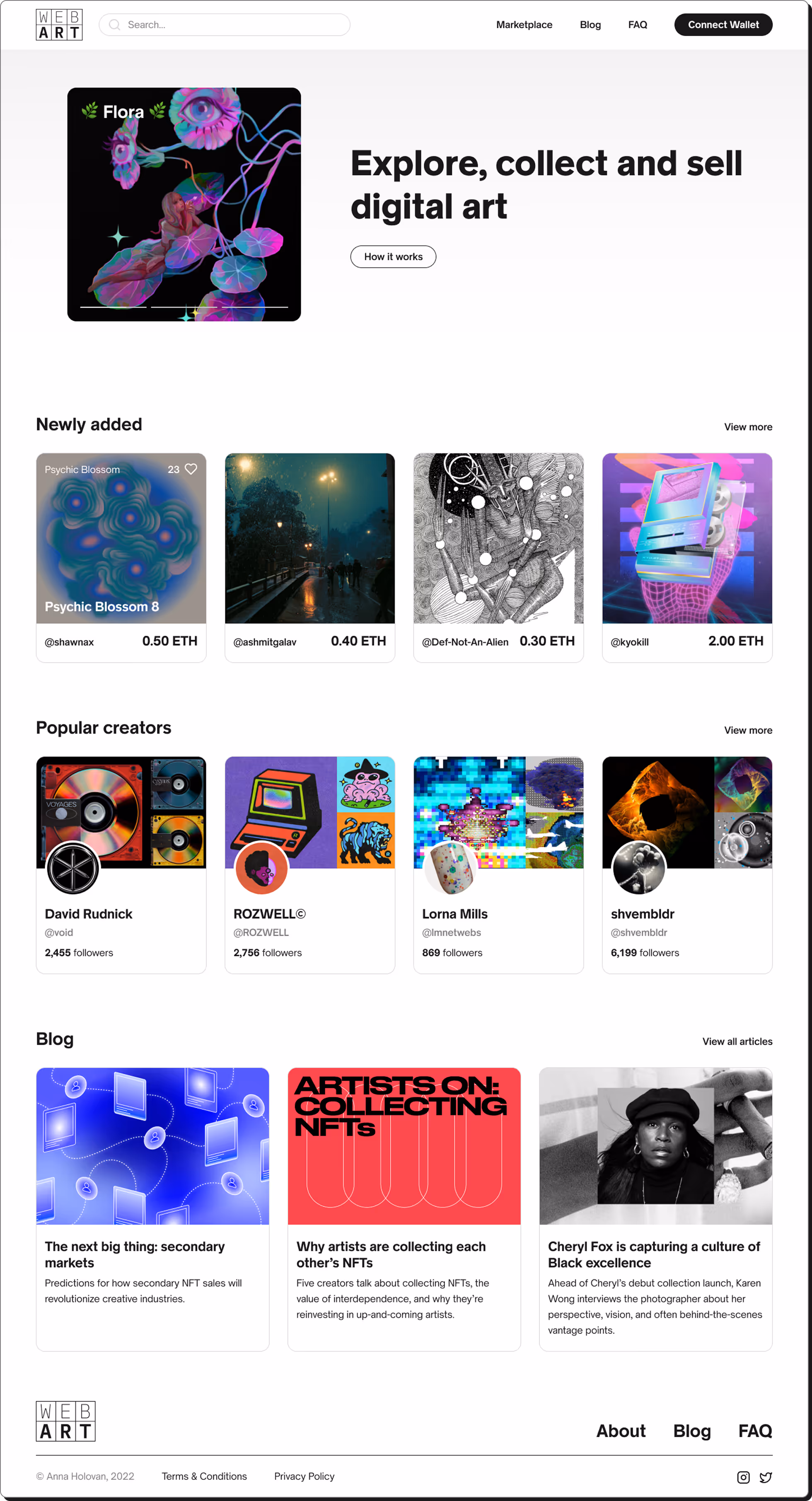 The aim of the project was to create a design concept for cryptoart marketplace. Target users range from millennials investing their goods in digital art to seniors buying traditional art but may want to explore the market of digital paintings.