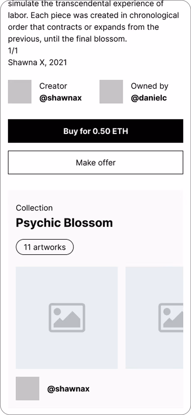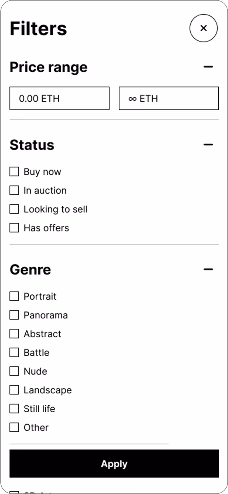 At the hero section of the main page, there is an animated slider that displays featured collection. In case of artwork cards, details about the artwork are shown on hover. At the marketplace, you can filter and sort items, choose the displayed currency, and switch between the categories (artworks, collections, creators).On the artwork page, you can view details about the item, buy it for the quoted price or make your offer, view artwork in full-screen, go to creator and owner profiles. There’s also a link to the full collection with preview of its items.